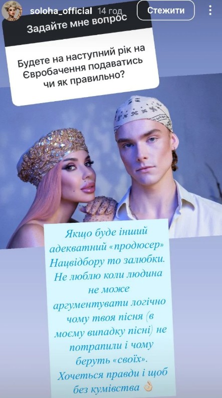 Прихильники спитали в Солохи, чи буде вона подаватися на наступний Нацвідбір на Євробачення. Співачка зазначила, що залюбки це зробить, якщо "буде інший адекватний продюсер".
