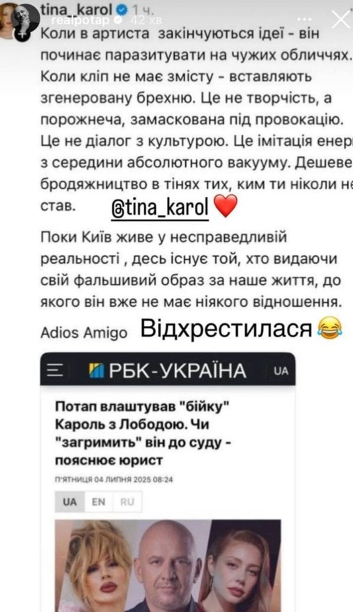 Потап відповідь артистки побачив і відповів коротко. Він опублікував скрін її повідомлення і написав, що вона "відхрестилась".