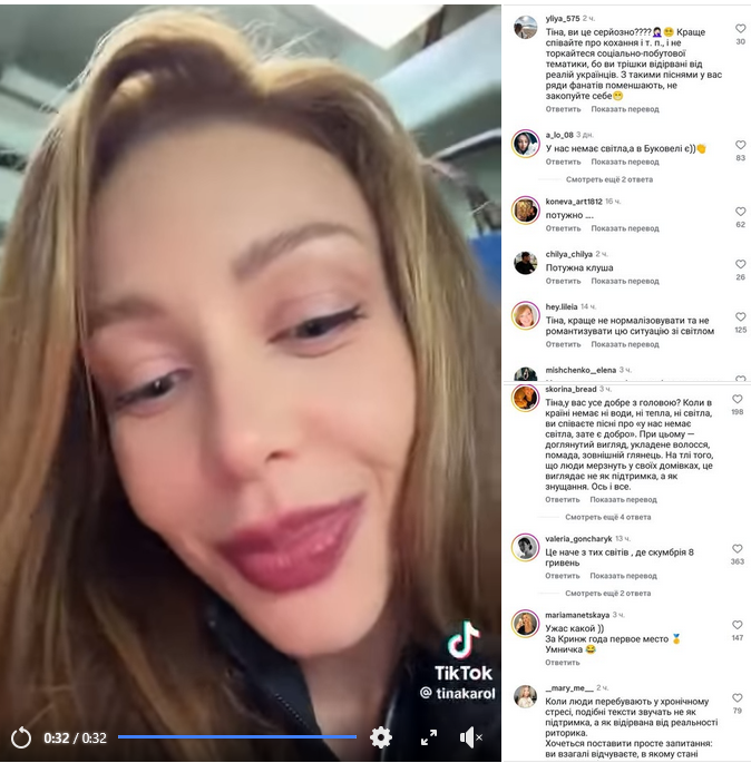 Українці активно обговорюють та висміюють у соцмережах нову пісню Тіни Кароль. Композиція присвячена проблемам енергозабезпечення та побутовим незручностям, але робить акцент на єдності та "добрі"
