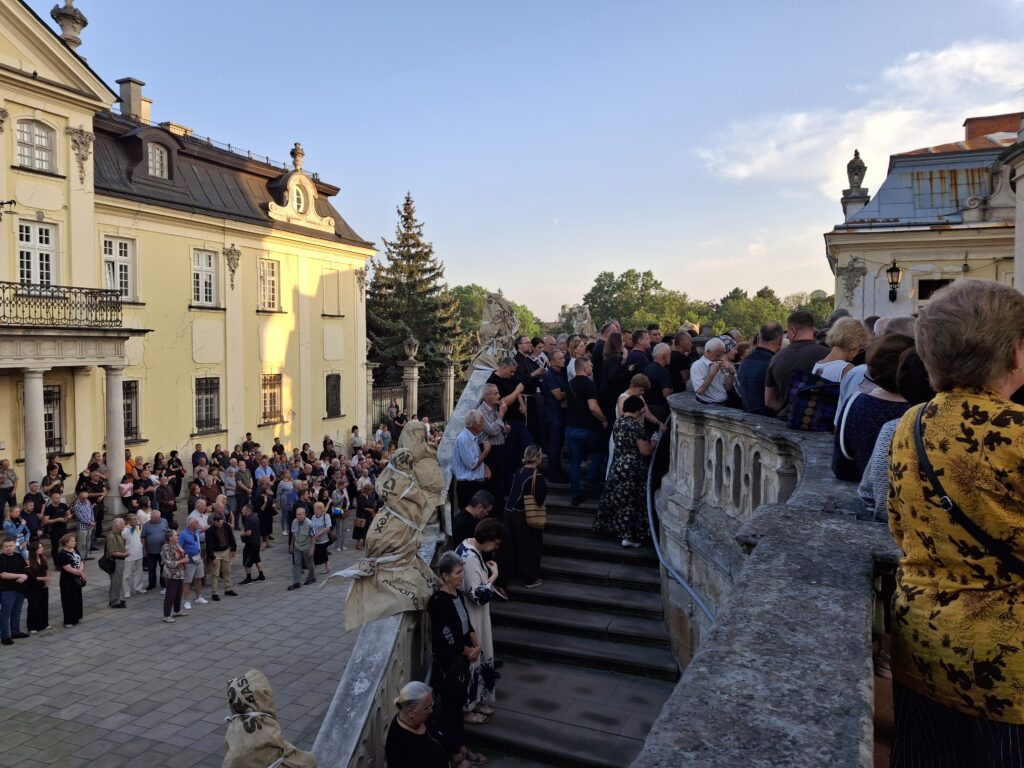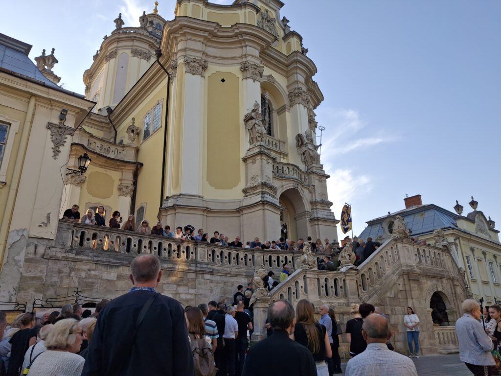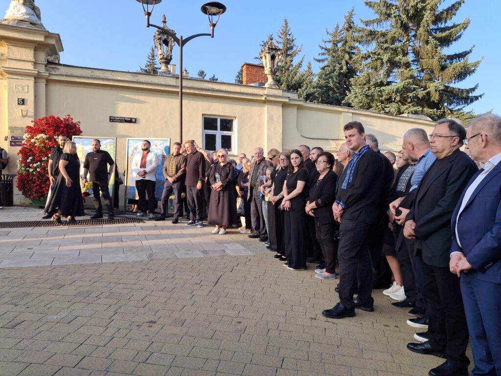 Чин похорону розпочався о 12:00 в оборі святого Юра (площа святого Юра, 5). У храмі вже зібралося багато людей, серед яких — відомі політики, посадовці та громадські діячі.