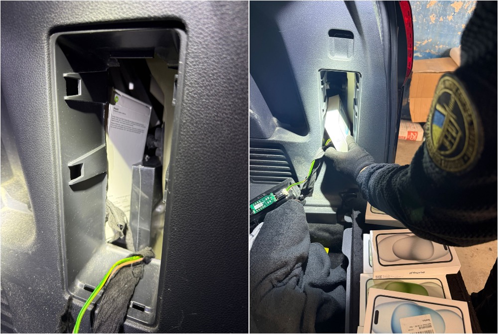 Попри те, що 32-річна жінка обрала "зелений коридор", у машині виявили десять iPhone 15 та 16 телефонів Samsung. Техніка була захована у спеціально облаштованому сховку в правому крилі авто.
