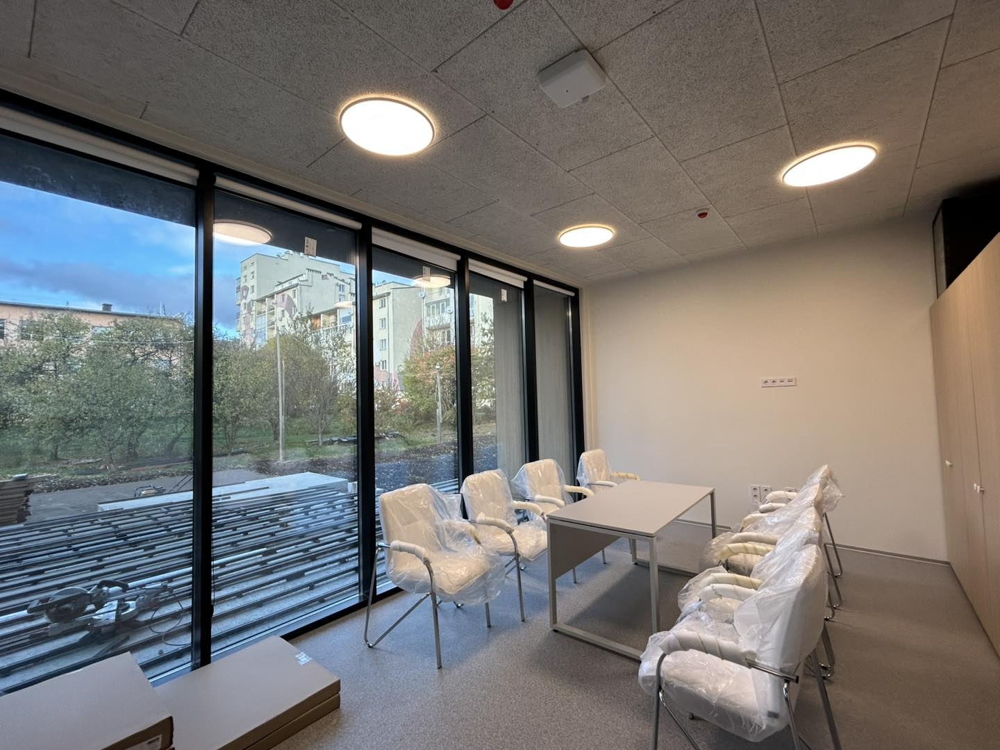 Всередині приміщення школа вже повністю готова до навчального процесу: класи обладнані сучасними партами, шафами та освітленням, а панорамні вікна відкривають просторий вигляд. Окремо відзначено зручності для вчителів у новій учительській.