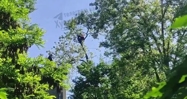 На кадрах видно, як чоловік сидить майже на самій верхівці дерева, на рівні п'ятого поверху.