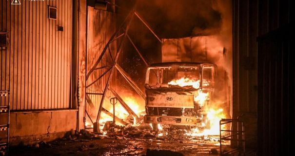 Після ворожої атаки у Дніпровському районі Києва палають склади, є перебої зі світлом та водою