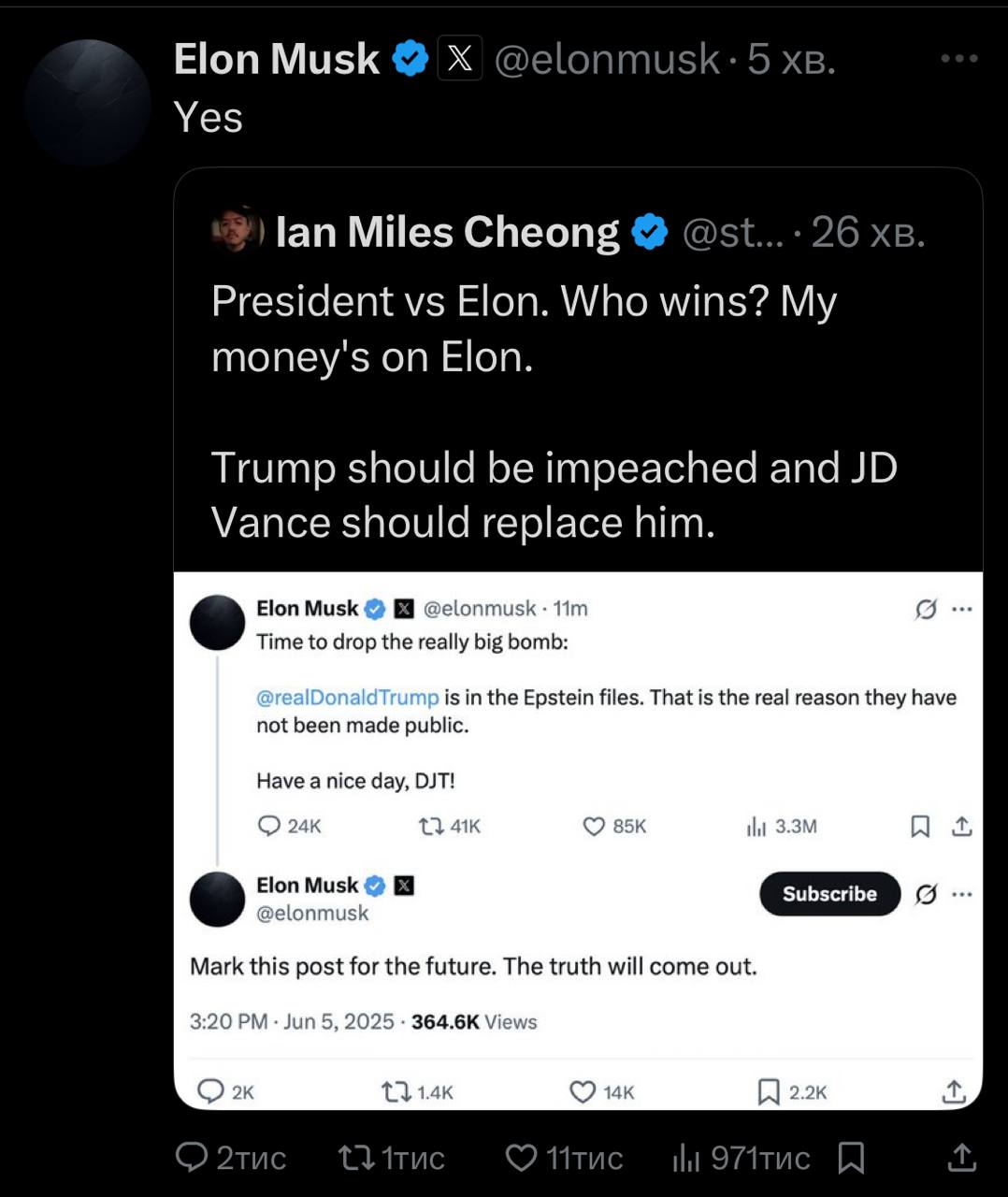 Згодом Ілон Маск заявив, що Дональд Трамп фігурує у файлах Епштейна. За словами Маска, це є причиною, чому ці файли досі не були оприлюднені.