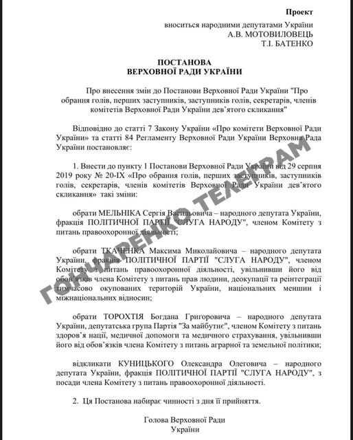 У Верховній Раді зареєстровано нову постанову щодо виключення народного депутата Олександра Куницького з парламентського комітету. Тепер документ має бути винесений до зали та поставлений на голосування