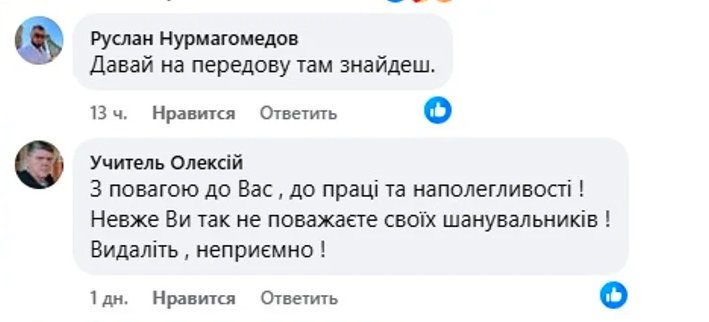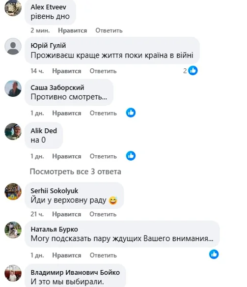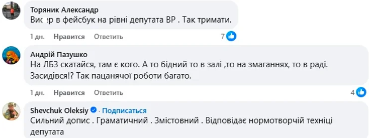 Пост викликав шквал критики в коментарях. Користувачі нагадали, що в країні триває війна, і депутату як представнику влади не варто жартувати подібним чином.