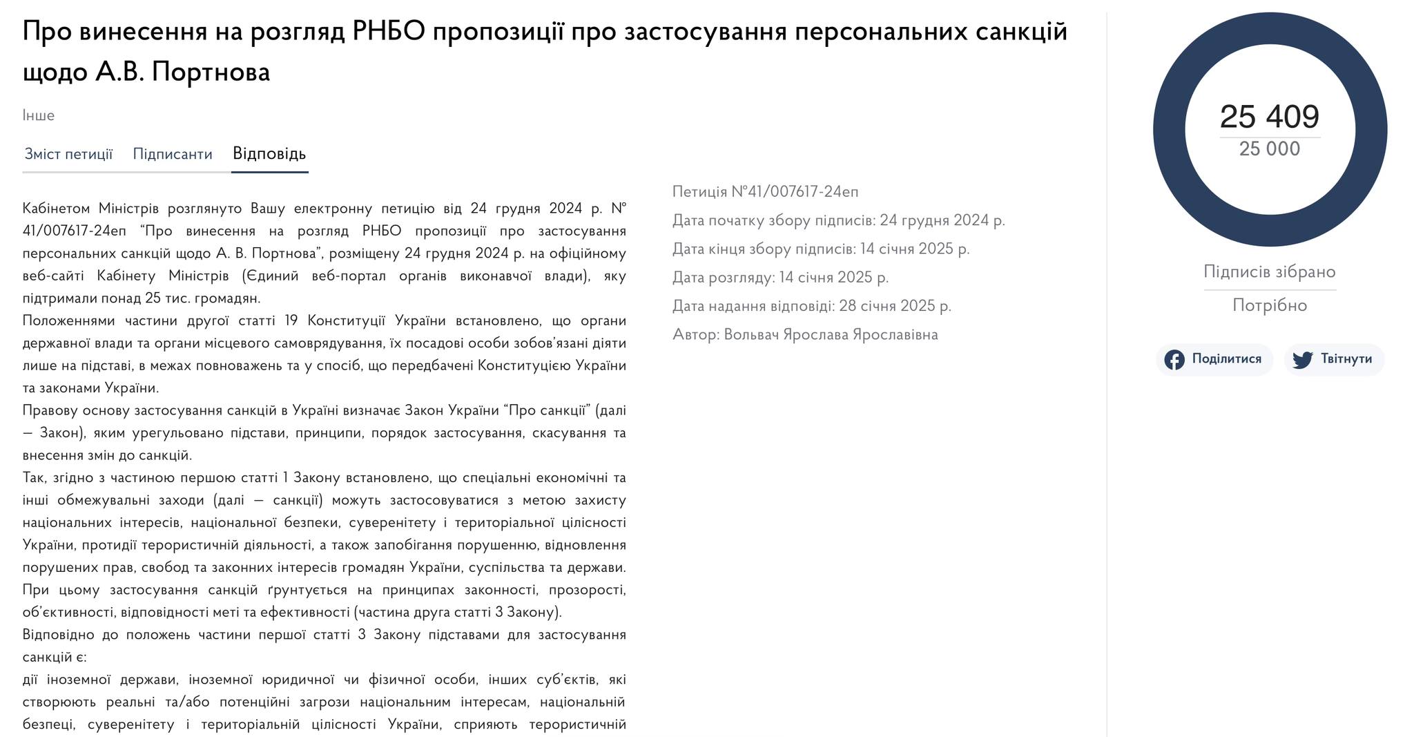Петиція Соловйова з'явилася через місяць після реєстрації петиції ЄС щодо санкцій проти Андрія Портнова, яка зібрала 25 тисяч підписів, але була проігнорована тоді ще міністром економіки Юлією Свириденко.