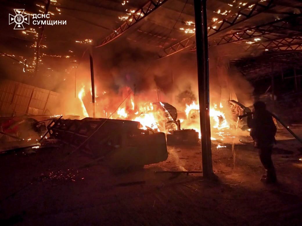 На Сумщині після атаки дрона горів склад із технікою
