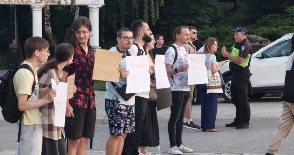 У Сумах кілька активістів вийшли на акцію протесту проти скандального закону №12414, який обмежує повноваження НАБУ і САП. Слідкувати за перебігом мітингу приїхали три патрулі поліції