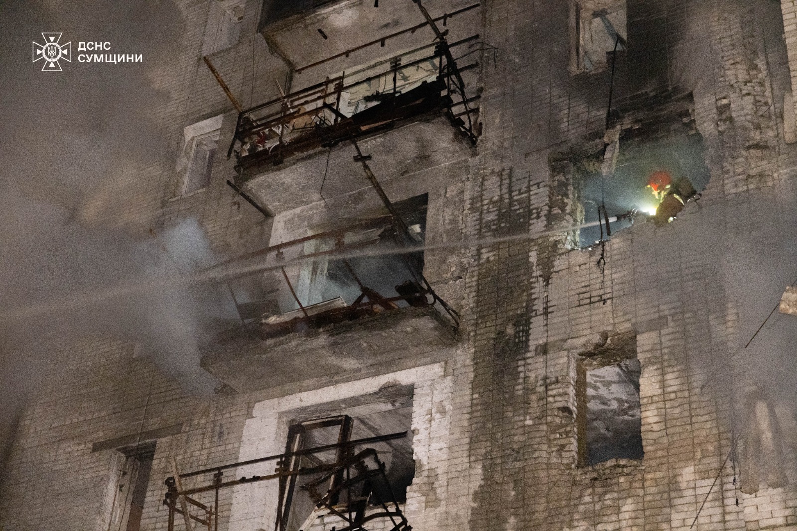 У ніч на 8 грудні в місті Охтирка Сумської області російські війська завдали удару безпілотником по дев'ятиповерховому житловому будинку. Внаслідок атаки в квартирах із другого по п'ятий поверх спалахнула пожежа