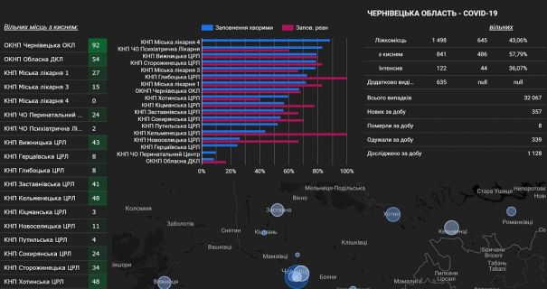 У Чернівецькій обласній державній адміністрації розробили дашборд, за допомоги якого можна довідатися, скільки ліжок для хворих на коронавірус розгорнуто у госпітальних базах Буковини та про відсоток їхнього заповнення.