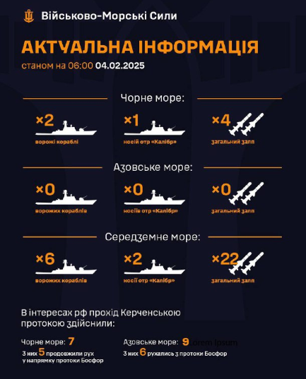 Водночас в Азовському морі ворожі кораблі відсутні.У Середземному морі 6 ворожих кораблів, з яких 2 є носіями крилатих ракет "Калібр" загальним залпом до 22 ракет.