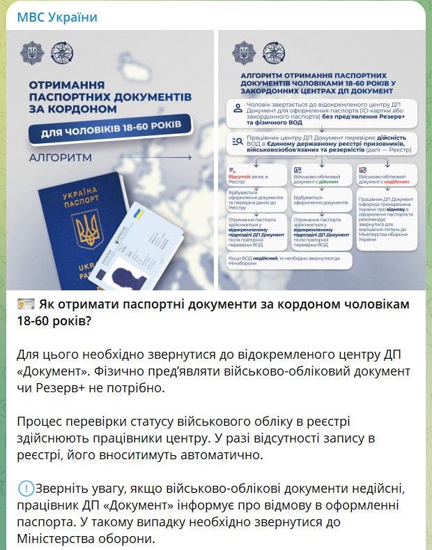 Нагадаємо, громадянам України віком 18-60 років, які перебувають за кордоном, не потрібно пред’являти фізично військово-обліковий документ при оформленні паспортних документів. Також чоловікам не обов’язково проходити військово-лікарську комісію (ВЛК).