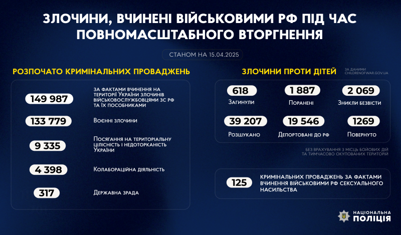 Станом на 15 квітня 2025 року слідчі Нацполіції відкрили 149 987 кримінальних проваджень за фактами злочинів, вчинених військовослужбовцями РФ та їхніми спільниками з початку повномасштабного вторгнення