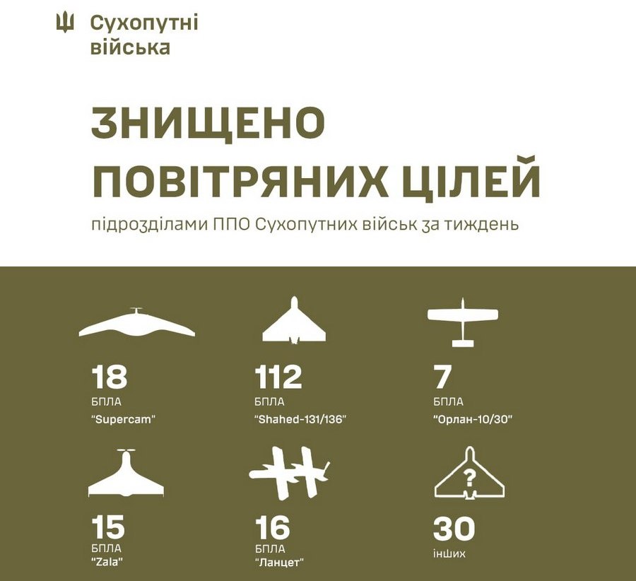 Протягом тижня ППО Сухопутних військ знищила 198 засобів повітряної розвідки та нападу РФ