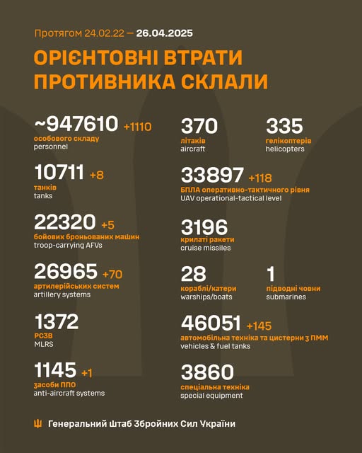 Загальна кількість втрат армії РФ із початку повномасштабного вторгнення в Україну орієнтовно становить понад 947 тисяч солдат.