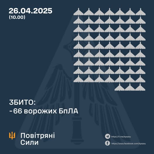 Станом на 10.00 підтверджено збиття 66 ударних БпЛА типу Shahed (безпілотників інших типів) на сході, півночі, півдні та в центрі країни.