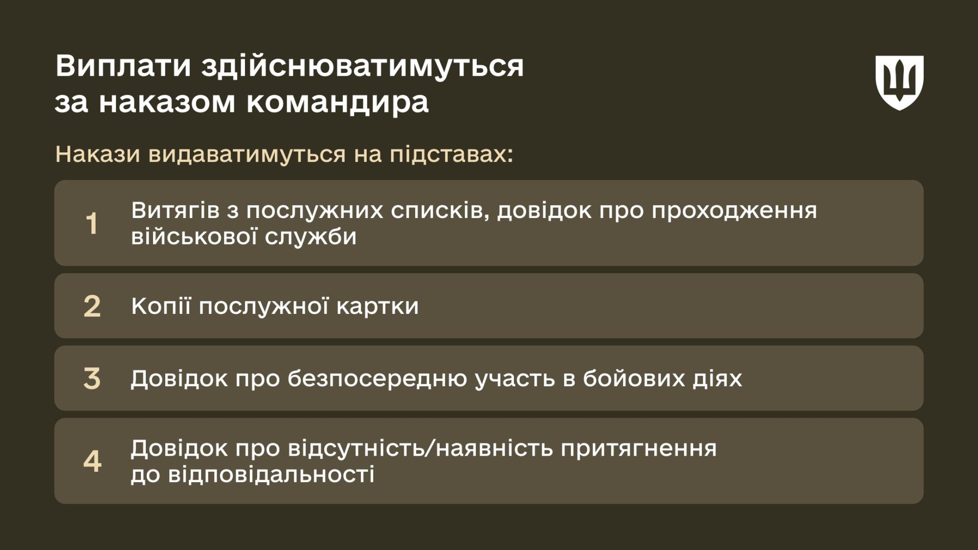 "Окреме доручення міністра оборони № 999/уд від 20 лютого 2025 року про реалізацію положень урядової постанови визначає, що виплата винагороди для цієї категорії військовослужбовців здійснюється за наказом командира військової частини", — йдеться у повідомленні.