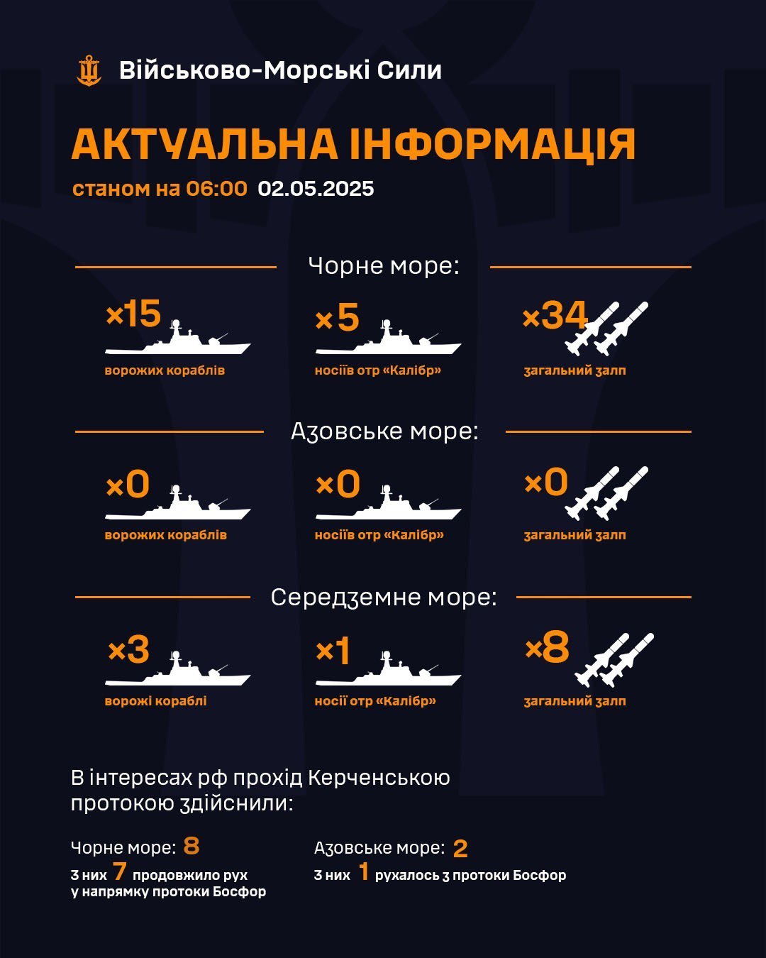 У п'ятницю вранці, 2 травня, російська армія тримає в акваторії Чорного моря 15 ворожих кораблів, п'ять з яких є носіями крилатих ракет "Калібр". Загальний залп — до 34 ракет