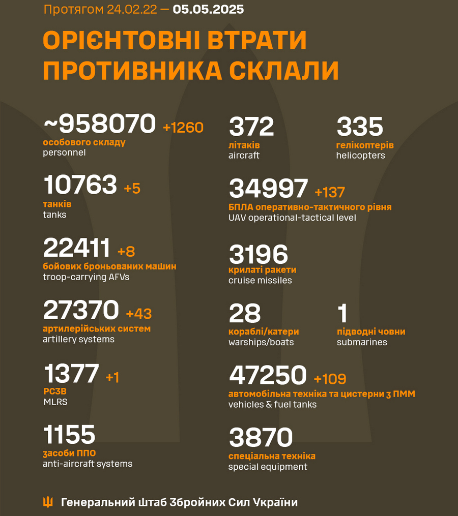 Вчора, 4 травня, Сили оборони України знищили ще 1 260 російських загарбників, п'ять танків, одну систему РСЗВ, вісім бойових броньованих машин, 43 артсистеми, 137 БпЛА оперативно-тактичного рівня та 109 одиниць автомобільної техніки й автоцистерн
