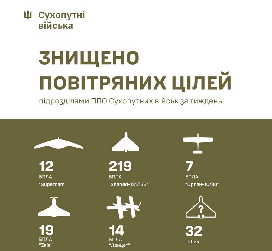 Протягом тижня протиповітряна оборона Сухопутних військ знищила 303 засоби повітряної розвідки та нападу РФ