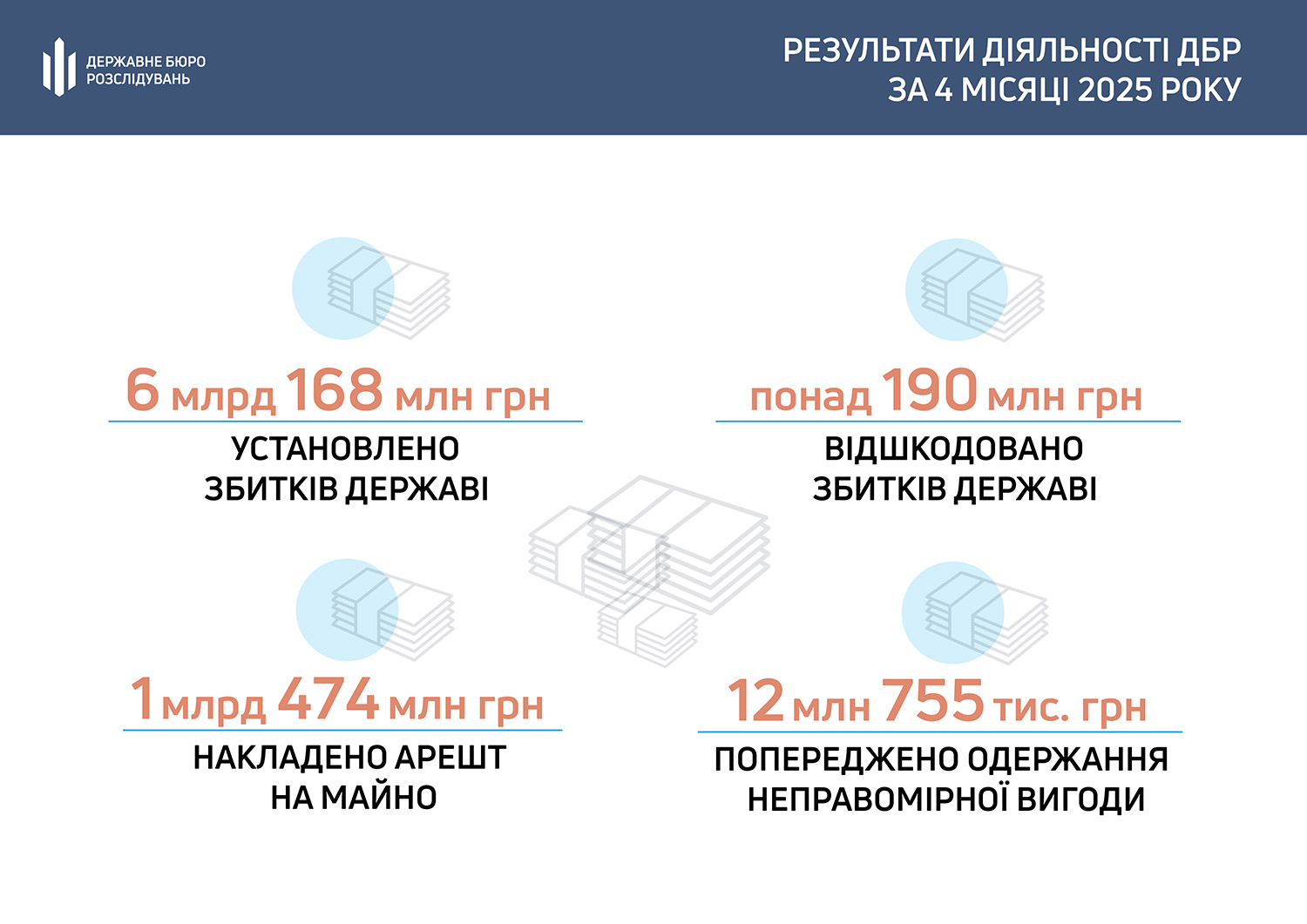 Як зазначається, за перші чотири місяці 2025 року зафіксовано збитки державі, завдані фігурантами кримінальних проваджень, на загальну суму 6 млрд 168 млн гривень.