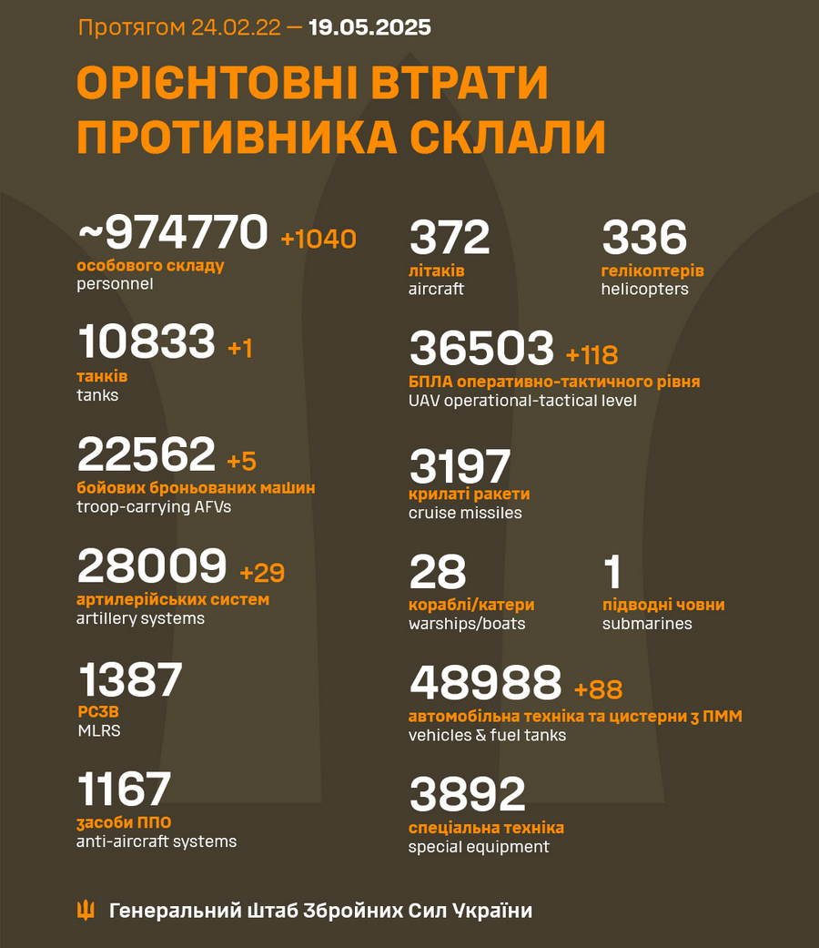 Вчора, 18 травня, Сили оборони України знищили 1 040 російських загарбників, танк, п'ять бойових броньованих машин, 29 артсистем, 118 БпЛА оперативно-тактичного рівня та 88 одиниць автомобільної техніки й автоцистерн