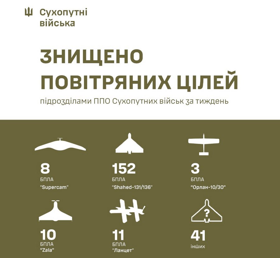 Протягом тижня протиповітряна оборона Сухопутних військ знищила 225 засобів повітряної розвідки та нападу РФ