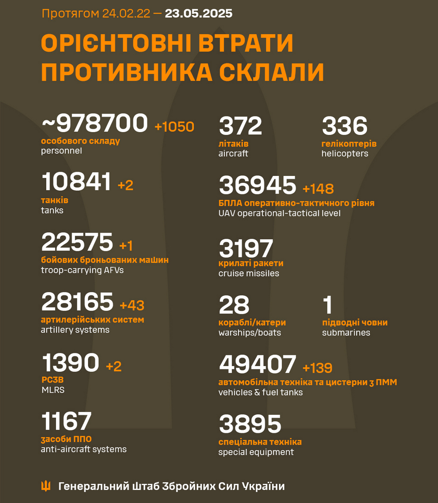 Протягом минулої доби, 22 травня, Сили оборони України знищили 1 050 російських загарбників, два танки, одну ББМ, 43 артсистеми, дві РСЗВ, 148 БпЛА оперативно-тактичного рівня та 139 одиниць автомобільної техніки й автоцистерн