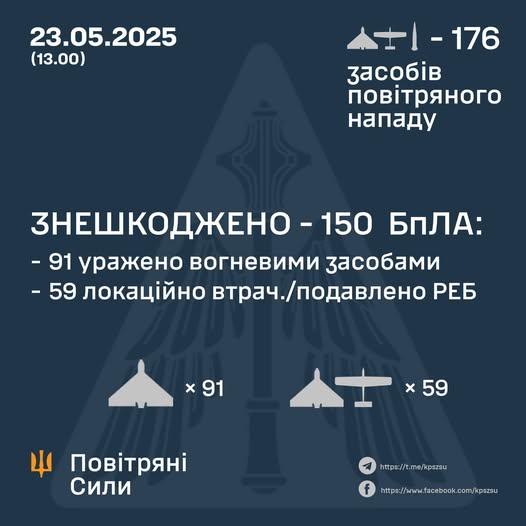 Станом на 13:00 знешкоджено 150 ворожих безпілотників: 91 — знищено вогневими засобами ураження, 59 — локаційно втрачені (без негативних наслідків).