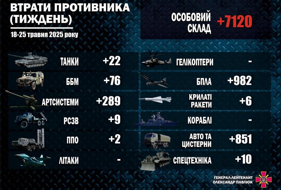 За минулий тиждень, із 18 по 25 травня, Сили оборони України знищили близько 7 120 окупантів, а також 2 247 одиниць озброєння та військової техніки російських загарбників