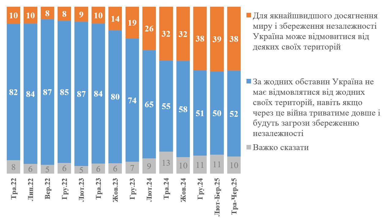 Готові прийняти певні територіальні втрати - 38% (у лютому 2025 року - 39%).