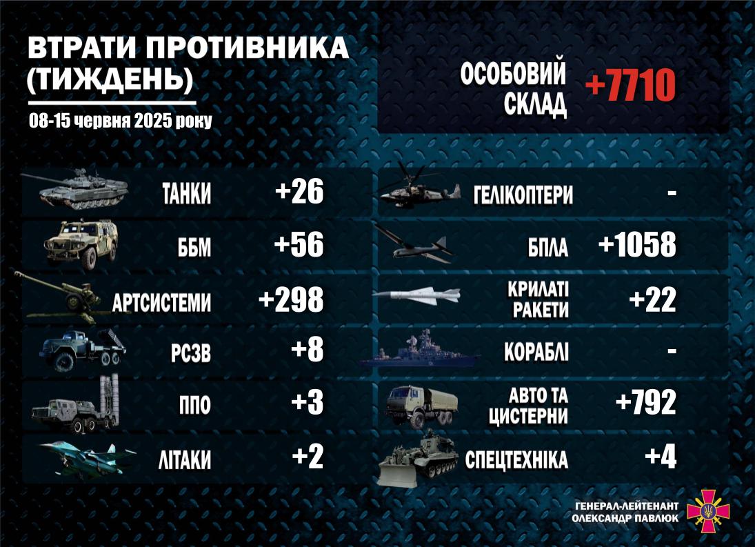 За минулий тиждень, із 8 по 15 червня, Сили оборони України знищили близько 7 710 окупантів, а також 2 269 одиниць озброєння та військової техніки російських загарбників