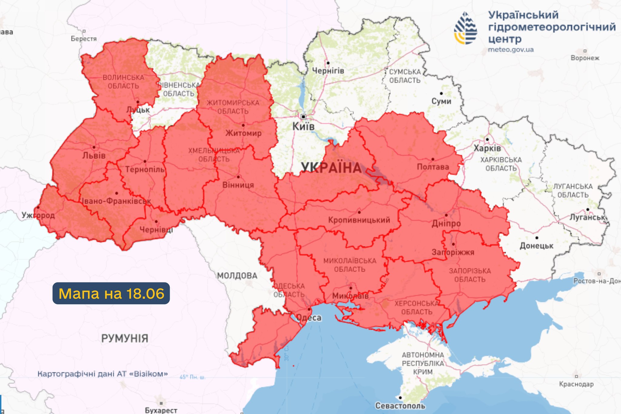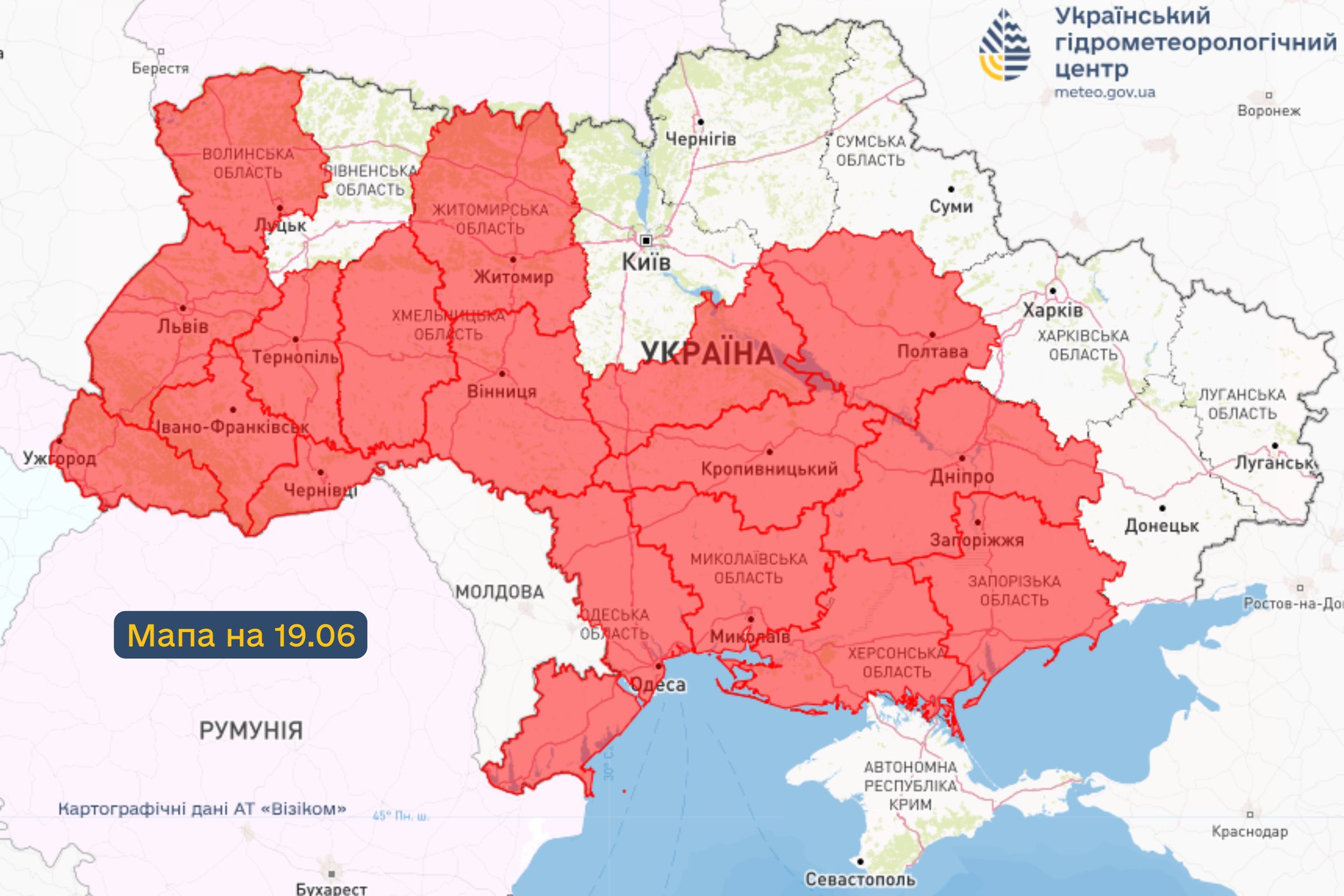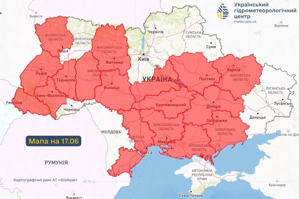 Заначається, що небезпека поширюється майже на всю територію країни, за винятком Автономної Республіки Крим, більшості північних областей, Рівненської області (17 червня), Чернівецької (18–19 червня) та Харківської (18–19 червня).