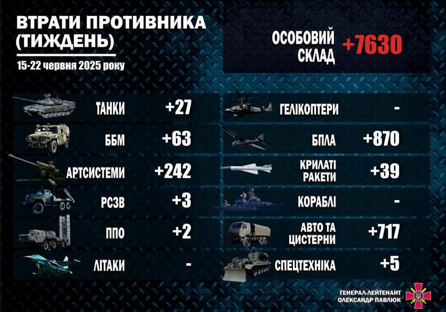 За минулий тиждень, із 15 по 22 червня, Сили оборони України знищили близько 7 630 окупантів, а також 1 968 одиниць озброєння та військової техніки російських загарбників