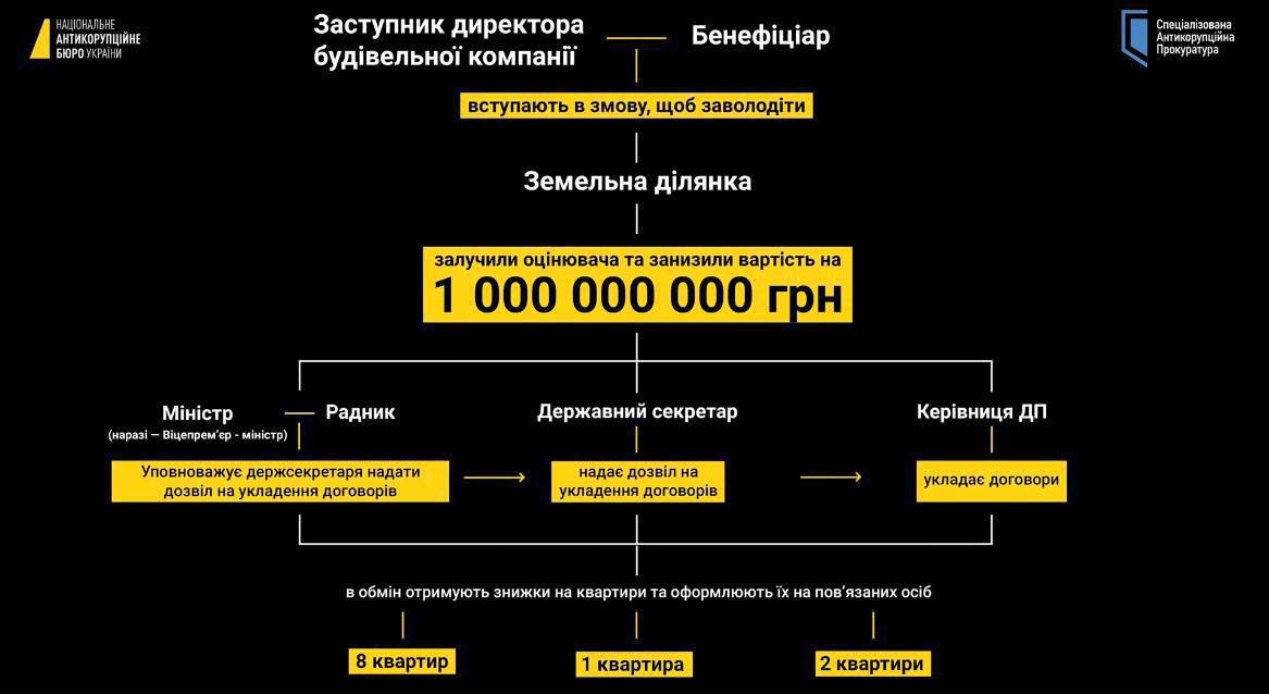 За даними правоохоронців, організатором схеми був один із забудовників. Він звертався до голови Мінрегіону, який разом із держсекретарем Мінрегіону, радником міністра та директоркою держпідприємства створив умови для передачі ділянки цьому ДП. Договори були укладені незаконно: різниця між ціною зі "знижкою" та ринковою вартістю перевищила мільярд гривень.