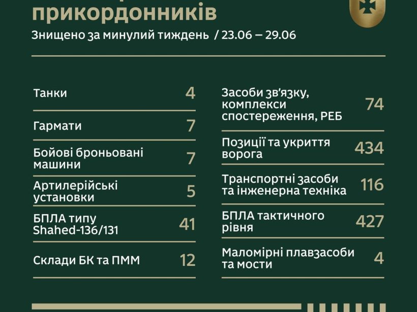 "Упродовж тижня, з 23 по 29 червня 2025 року, бійці Держприкордонслужби знищили 212 загарбників, 237 поранили, ще 3 окупантів взяли в полон", - йдеться у повідомленні.
