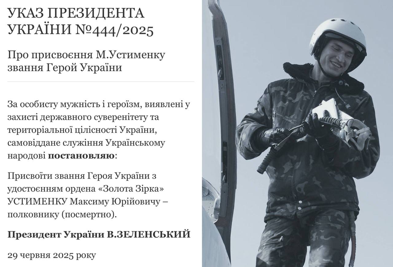 Під час виконання бойового завдання в ніч на 29 червня загинув український військовий льотчик, полковник Максим Юрійович Устименко. У день його загибелі президент Володимир Зеленський підписав указ №444/2025, яким посмертно присвоїв йому найвище звання - Герой України.