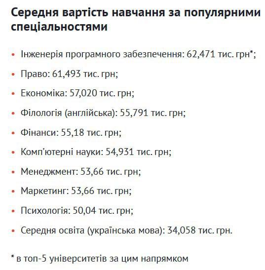 За підрахунками аналітиків вищезгаданого видання, найбільше доведеться заплатити тим, хто обирає такі популярні напрями як інженерія програмного забезпечення (понад 62 тис. грн), право (понад 61 тис. грн) або економіка (57 тис. грн). Трохи менше - за філологію, фінанси, менеджмент чи психологію. Найдоступнішою лишається "Середня освіта" (українська мова) - в середньому близько 34 тис. грн на рік.