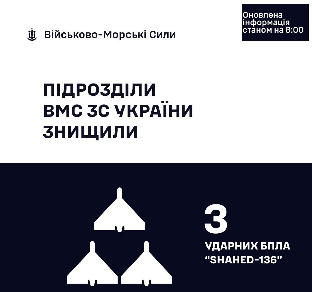 Сьогодні вночі, 21 липня, військові моряки збили три російські ударні дрони-камікадзе типу "Shahed-136"