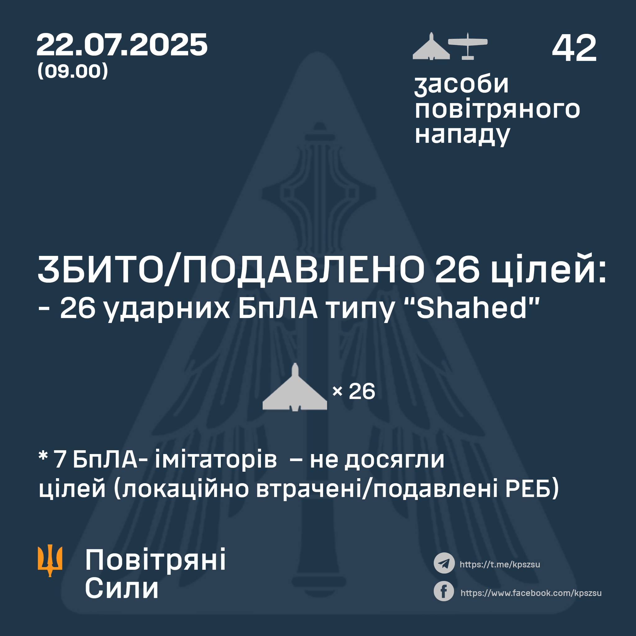 У ніч на 22 липня російська армія випустила по Україні 42 ударні безпілотники різних типів. Сили ППО збили 26 дронів, ще сім — локаційно втрачені