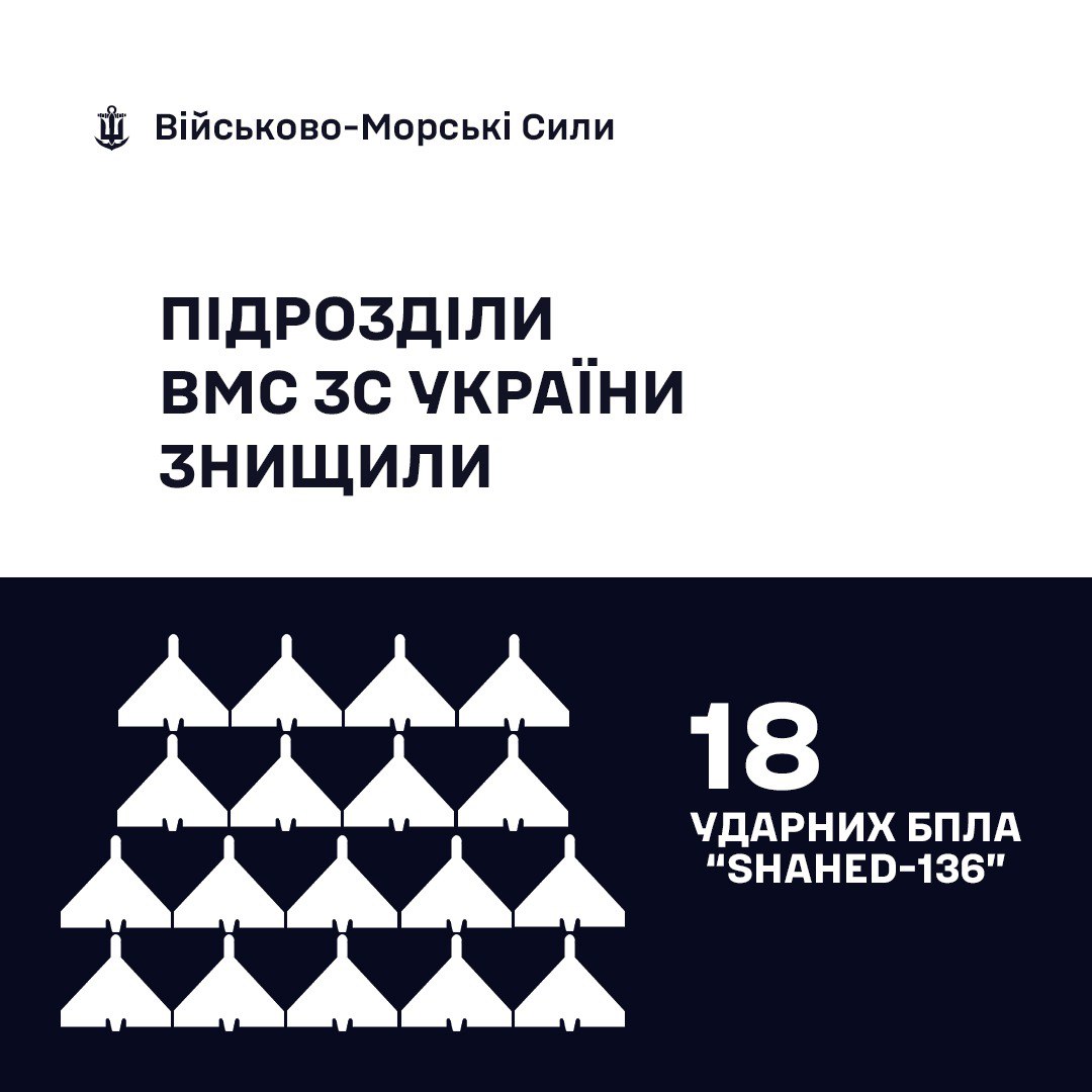 Сьогодні вночі, 24 липня, під час чергової масованої атаки РФ військовослужбовці ВМС ЗСУ спільно з моряками-прикордонниками збили 18 російських ударних дронів-камікадзе типу "Shahed-136"