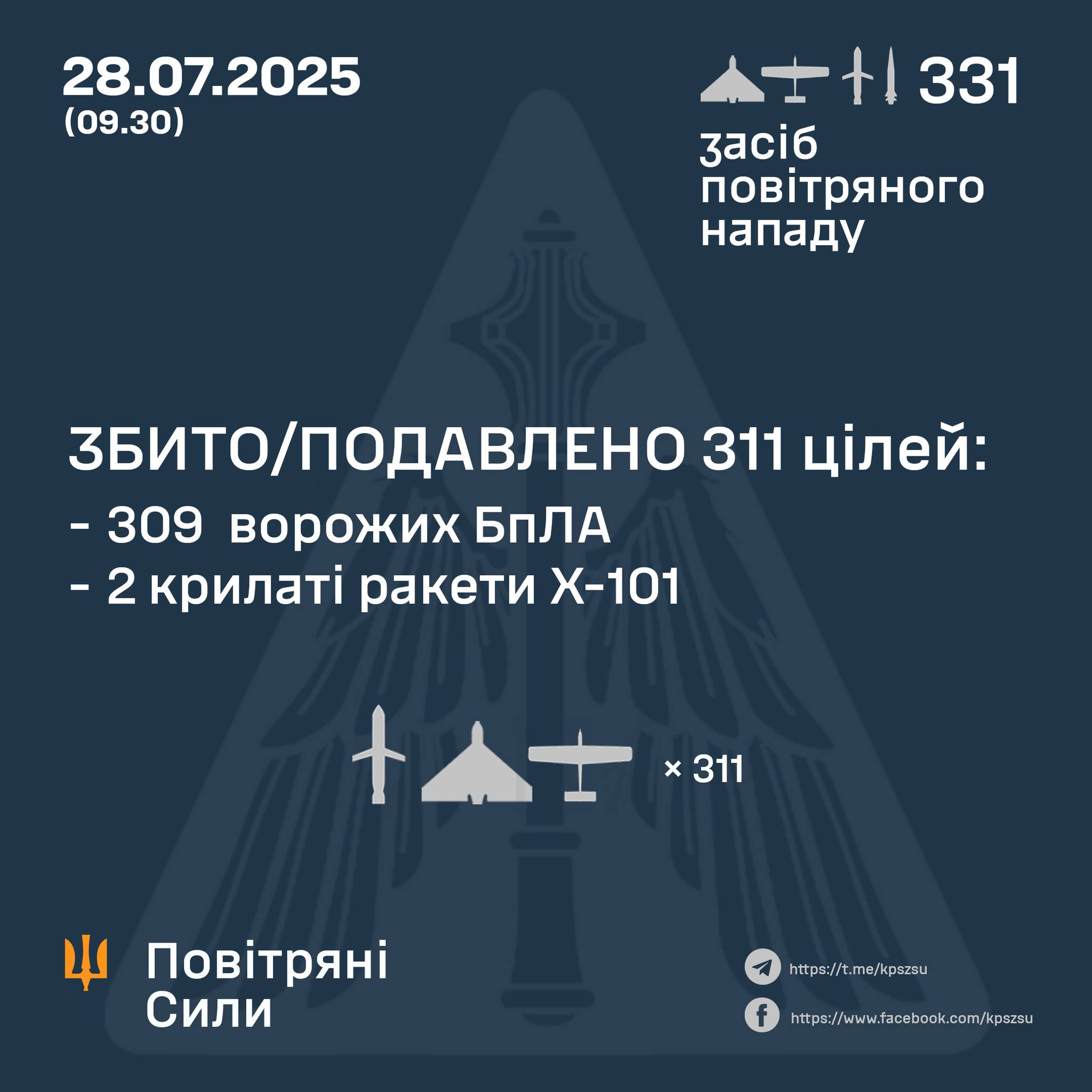 У ніч на 28 липня армія РФ запустила по Україні сім ракет, а також 324 ударних дронів типу "Shahed" і безпілотників-імітаторів різних типів. Сили ППО знешкодили 311 ворожих цілей