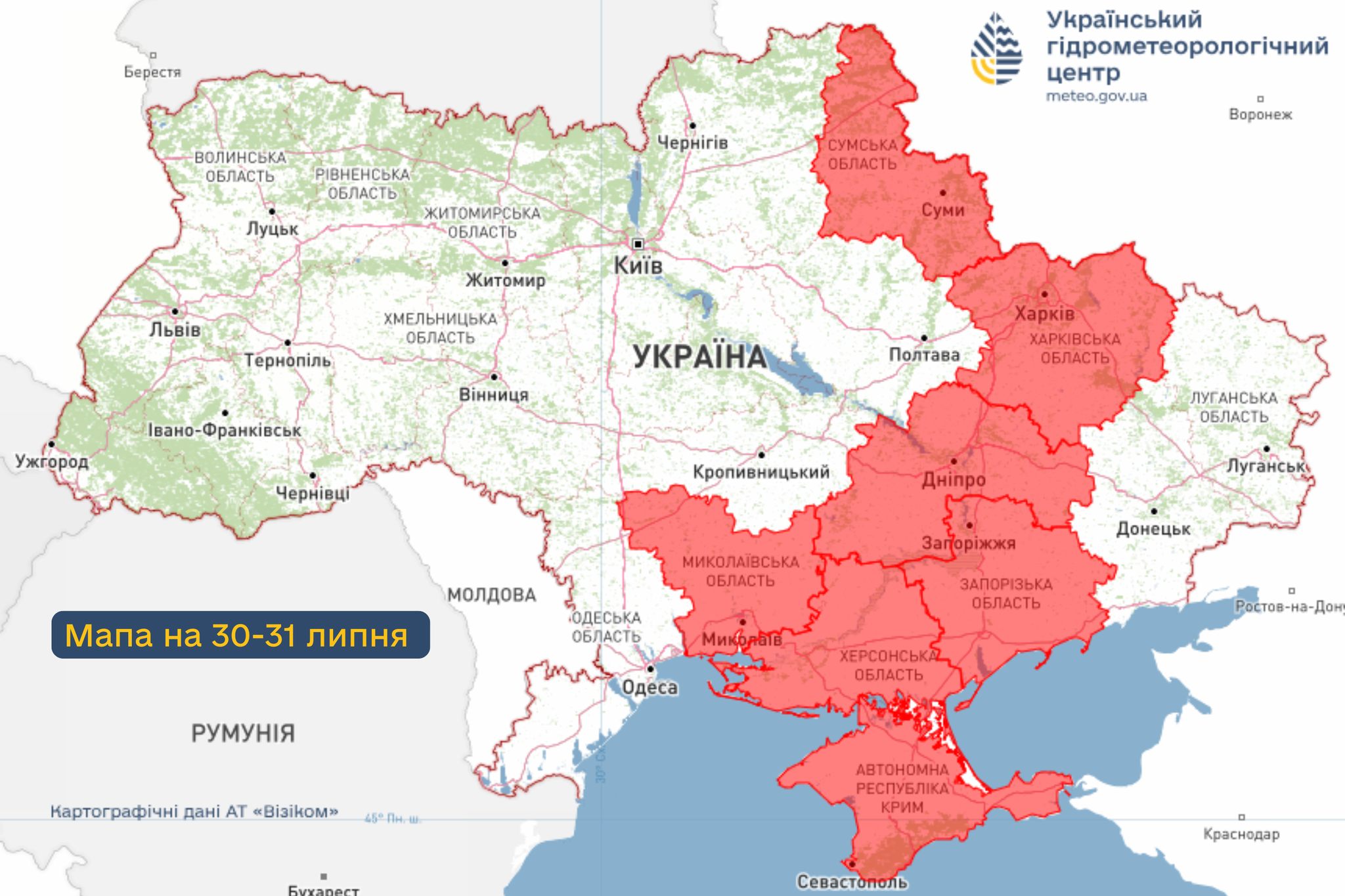 Зазначається, що з 30 липня по 2 серпня у південній частині країни (крім Одещини), а також у Дніпропетровській, Харківській та Сумській областях очікується надзвичайний рівень пожежної небезпеки.