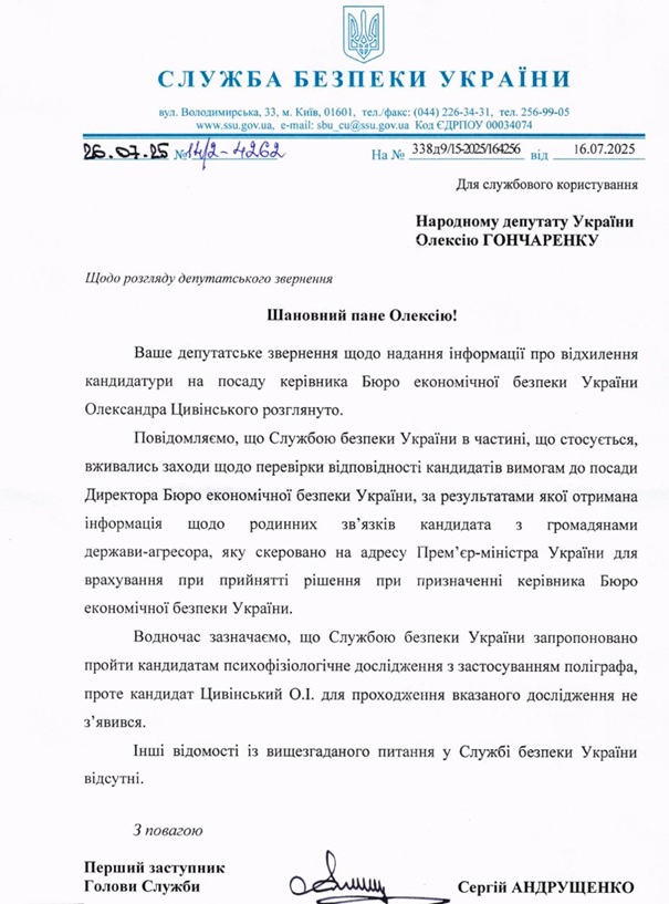 Відповідь датована 26 липня - ще до заяви прем’єр-міністра Юлії Свириденко про те, що кандидат погодився пройти поліграф.