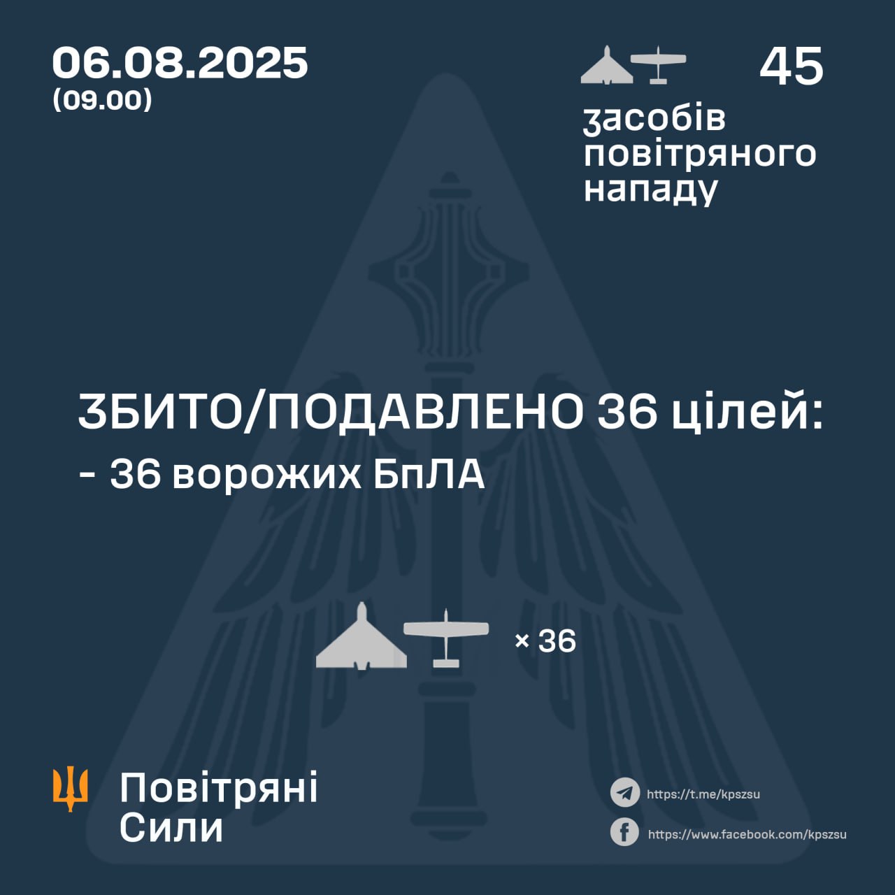 У ніч проти 6 серпня російська армія атакувала Україну 45-ма ударними БпЛА типу Shahed і безпілотниками-імітаторами різних типів. Знешкодити вдалося 36 із них