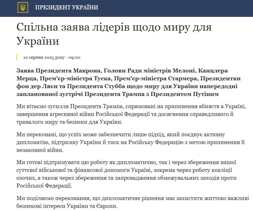 Лідери кількох європейських країн оприлюднили спільну заяву щодо мирного врегулювання конфлікту в Україні напередодні запланованої зустрічі президентів Трампа і Путіна.