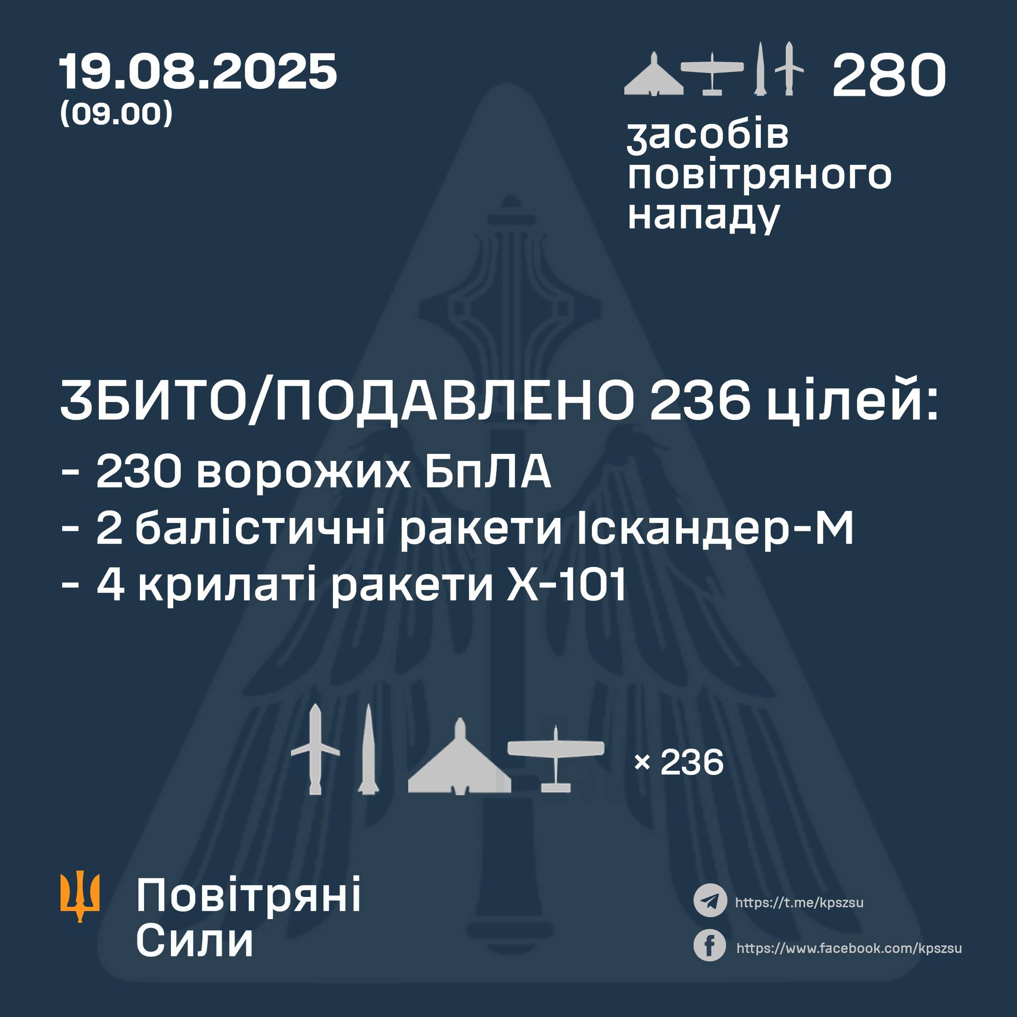 Сили оборони відбили більшість повітряних загроз. Згідно з попередніми даними на 09:00, українська ППО знищила або подавила 236 повітряних цілей.
