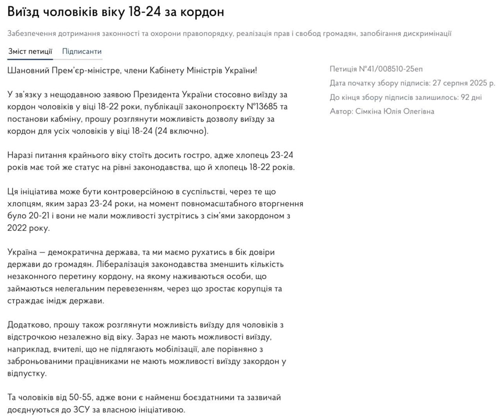 У документі зазначається, що ситуація особливо гостро стосується чоловіків 23–24 років. На момент початку повномасштабного вторгнення їм було лише 20–21 рік, і відтоді вони не мали змоги відвідати своїх рідних за кордоном. Автор петиції підкреслює, що Україна є демократичною державою, тому варто розвивати довіру між владою та громадянами.